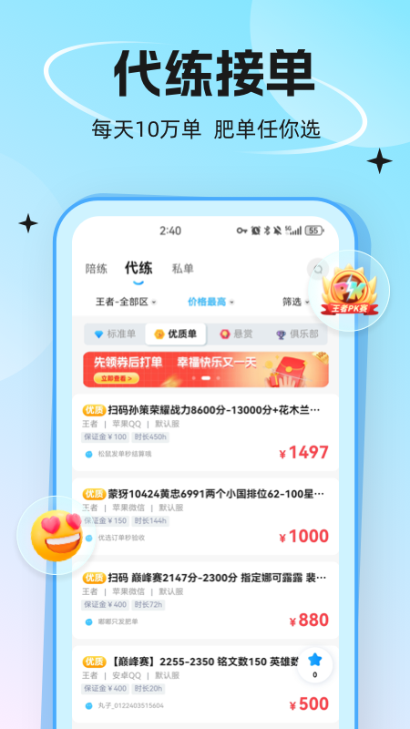 代练丸子是一款专注于游戏代练服务的软件,它为广大游戏玩家提供了一个便捷、安全且高效的代练交易平台。在这个平台上,无论是热门的竞技游戏,还是具有一定难度的养成类游戏,玩家都能轻松找到合适的代练人员来帮助自己提升游戏账号的等级、段位等。平台涵盖了丰富多样的游戏类型,几乎满足了不同玩家对于各类游戏代练的需求,致力于让玩家在游戏中能够更加轻松地体验到更高层次的乐趣。