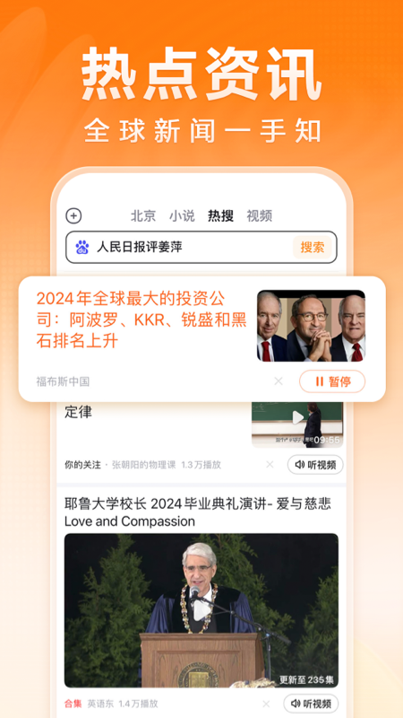 想查什么,直接说出来,强大的中文语音识别技术能精准理解你的意图,并播报出搜索结果。海量小说、相声评书、新闻资讯、热门短剧等内容全部免费畅听,都市热血、甜宠言情、玄幻武侠等各类题材应有尽有,总能找到你的心头好。首页设计清晰直观,会根据你的兴趣推荐内容,找书非常方便。除了听,这里还能看,全球实时热点、生活小贴士和实用技巧也能一键获取,让日常生活变得更智慧。