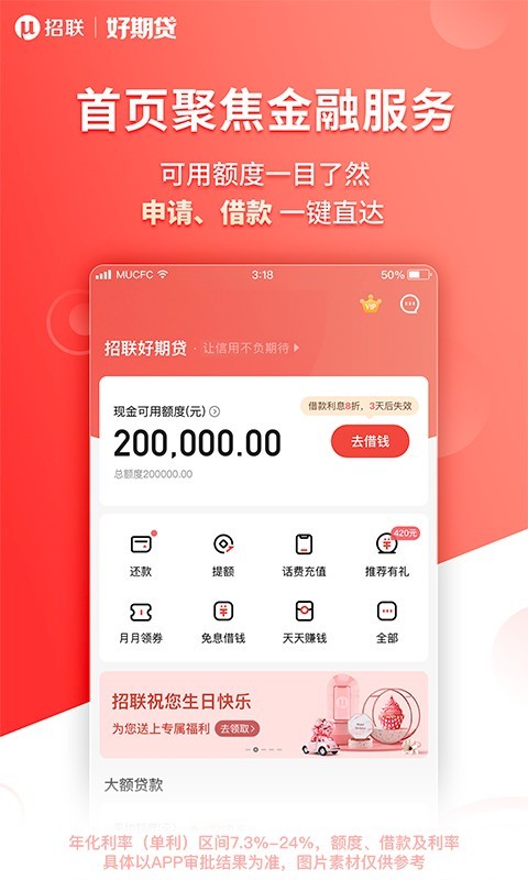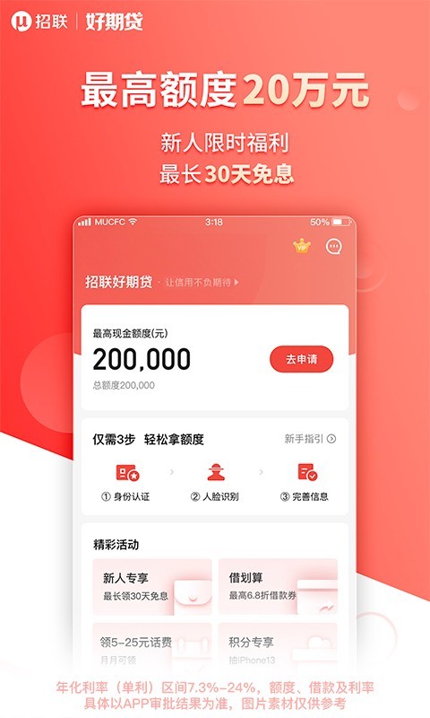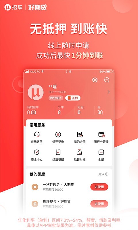 该应用采用了先进的大数据分析技术,能够全面、准确地评估用户的信用状况。通过对用户的个人信息、消费记录、信用历史等多方面数据的分析,系统能够快速判断用户的信用风险,从而决定是否给予借款以及借款的额度和期限。这种科学的风控体系不仅保障了平台的资金安全,也为用户提供了公平、公正的借款环境。招联好期贷与多家金融机构合作,资金来源广泛且稳定。这使得用户在申请借款时,能够获得更充足的资金支持,提高了借款的成功率。应用的界面设计简洁明了,操作方便快捷。即使是初次使用的用户,也能轻松上手,快速完成借款申请等操作。