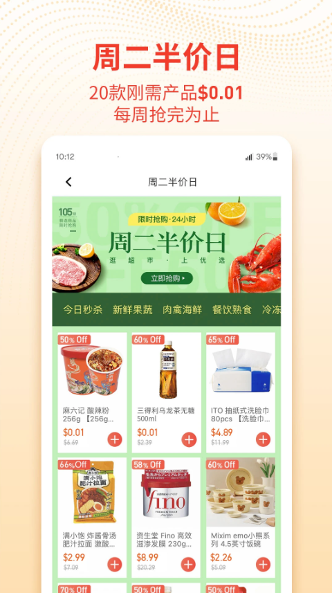 核心功能包括每日精选商品推荐、实时更新的优惠活动、个性化购物清单以及便捷的比价工具。消费者可通过简洁的操作浏览海量商品,享受一站式的购物服务,覆盖从日常生活用品到时尚潮流单品的广泛需求。在服务体验上,支持多种支付方式与灵活的配送服务,尤其注重配送时效,承诺当天下单可在24小时内到货,以保障食材的最佳食用时间。对于满足一定金额的订单,还提供免费配送服务。