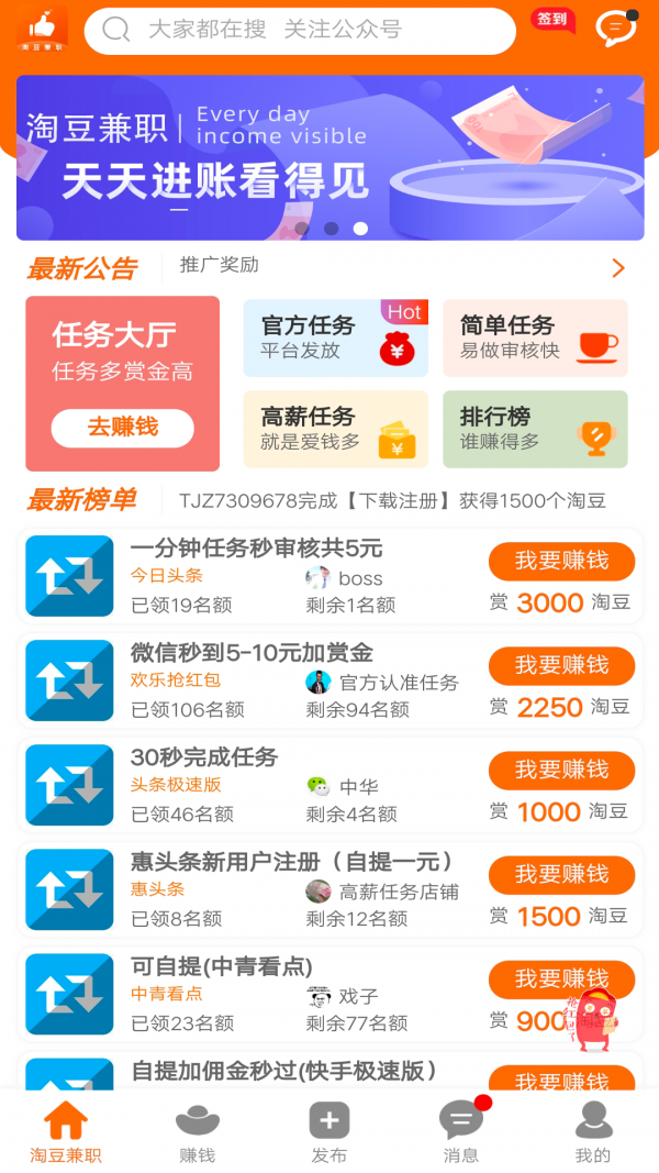 1.淘豆兼职软件操作界面友好,用户可以根据自己的需求和兴趣,快速筛选出适合自己的兼职职位。不论是教育辅导、传单派发、调研问卷、数据录入,还是远程办公类的兼职工作,淘豆兼职都能提供丰富选择。