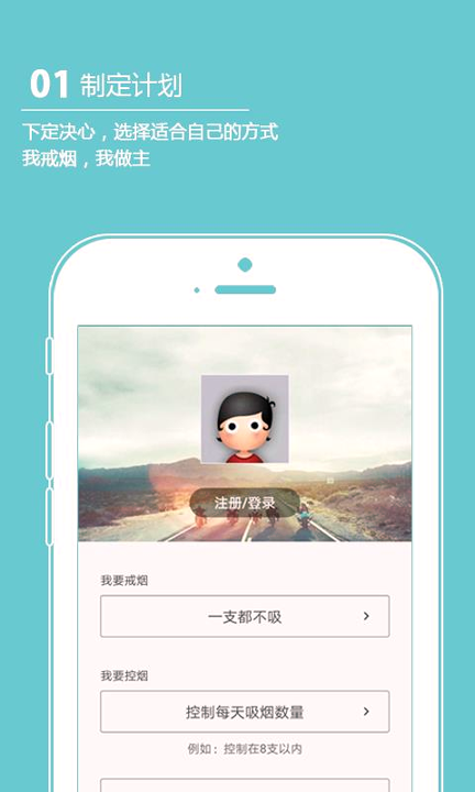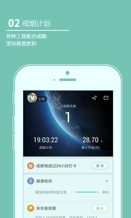 用户启动应用后,需填写吸烟史、日均数量等基础信息,系统据此生成专属戒烟方案。核心功能包含:每日抽烟数量记录与图表化统计分析,帮助用户直观了解控烟进展;根据戒烟时长自动升级用户等级(如新兵、士官等),通过军事化规则设计强化成就感。当烟瘾发作时,内置的呼吸练习、冥想引导等即时干预工具,可辅助用户度过关键5分钟冲动期。动态健康指数模块实时计算戒烟后身体恢复指标(如心肺功能改善、节省开支等),提供正向反馈。用户还可加入戒烟部落,在社区中分享经验、获取同伴鼓励,形成互助网络。