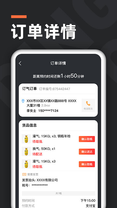 气来了配送的核心亮点在于其高效性与实时性。订单响应速度极快,业务员平均接单时间缩短至秒级,系统基于算法动态调度,避开拥堵路线,确保配送准时。应用提供全程可视化追踪功能,用户和业务员可实时查看订单状态、骑手位置及预计到达时间,增强透明度和信任。它创新性地整合了安全控制机制,如配送过程强制安检拍照、用户签字确认,数据一键上传存档,有效保障液化气运输安全。这些亮点不仅提升用户体验,还大幅减少运营风险。
