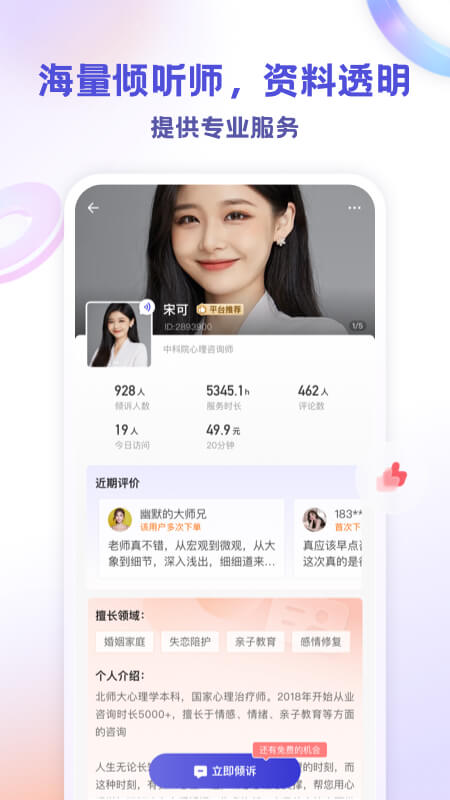 萤火倾诉是一款专注于心理健康服务的专业平台,致力于为现代人打造一个安全、私密且高效的情感倾诉与心理咨询环境。该平台深刻理解快节奏生活中心理健康的重要性,整合了专业咨询、情感支持与心理疏导等核心功能,成为陪伴倾诉者走过情绪低谷的温暖港湾。通过连接具备专业资质的倾听师与有需求的倾诉者,萤火倾诉为那些难以对身边人启齿或缺乏倾诉渠道的个体,提供了一个可靠的出口,帮助处理恋爱情感、家庭关系、职场压力、亲子关系及情绪疏导等多种心理困扰。