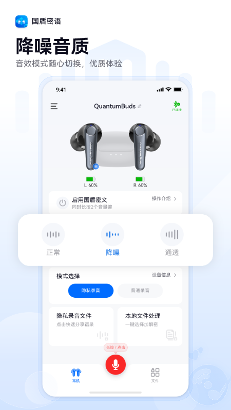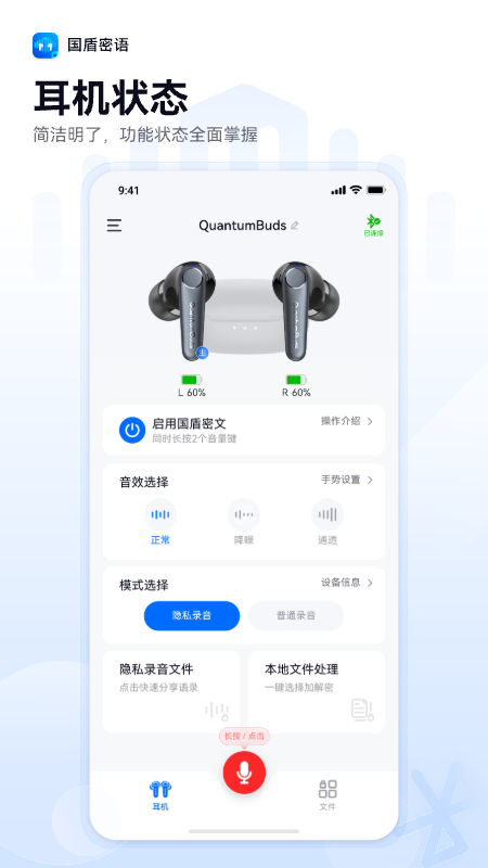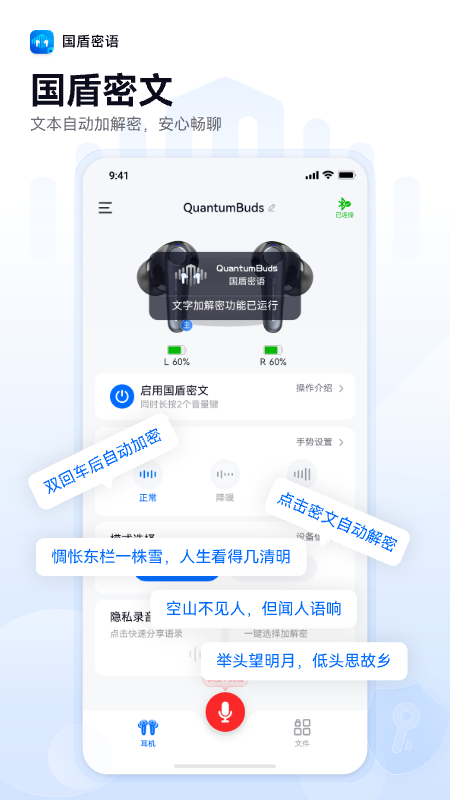 国盾密语是一款专为注重隐私沟通的朋友们打造的智能伴侣。它不仅仅是一个普通的蓝牙耳机管理工具,更是一位贴心的隐私守护者。这款应用将先进的加密技术与日常通讯场景深度融合,让你在享受便捷蓝牙耳机操控的为您的通话和聊天内容筑起一道坚实的安全屏障。无论是重要的商务讨论、私密的个人交流,还是需要严格保密的工作信息,国盾密语都能确保只有您和指定的接收方才能知晓内容,真正实现我的隐私我做主。