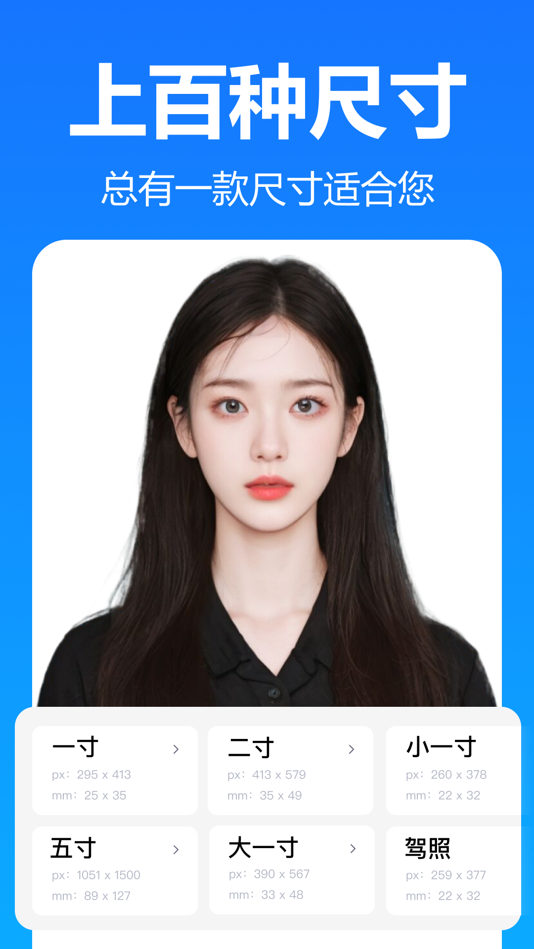 该工具支持证件照制作、背景底色更换、尺寸修改、大小调整、格式转换以及DPI分辨率设置等核心操作。内置超过1000种标准规格尺寸,除涵盖一寸、二寸、三寸、四寸、五寸等常用寸照外,还全面包含专升本、成人自考、毕业证、学位照、入学照等学历考试,英语四六级、普通话水平测试、计算机等级考试、教师资格证、驾驶证、导游证等职业资格,泰国签证、日本签证、新加坡签证等多个国家旅游签证,以及社保证、身份证等身份证件,同时支持结婚登记照与职业形象半身照拍摄,确保覆盖所有常见证件照制作场景。操作流程十分清晰,可通过首页选择所需尺寸,随后上传或拍摄照片,利用智能工具编辑后保存至相册。